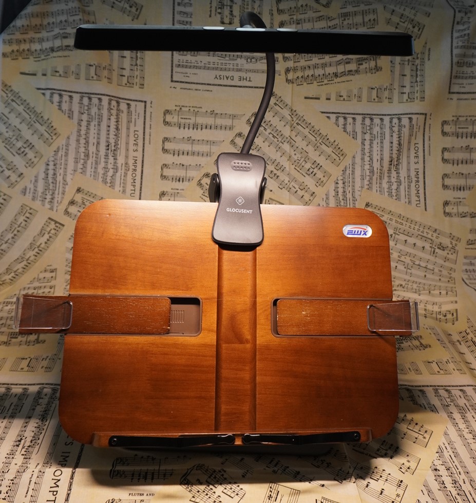 Self-contained music stand light, adjustable brightness, with hard sided carrying case. USB-C rechargeable.