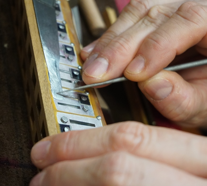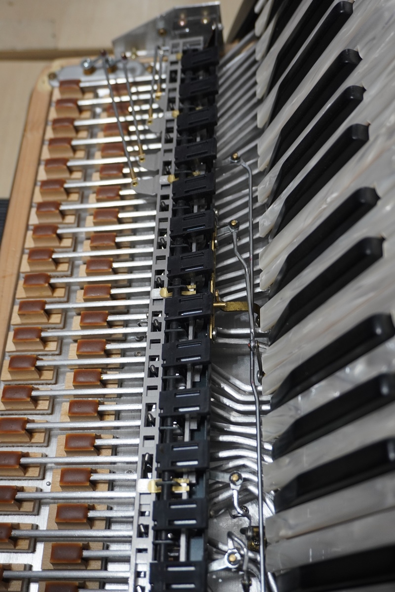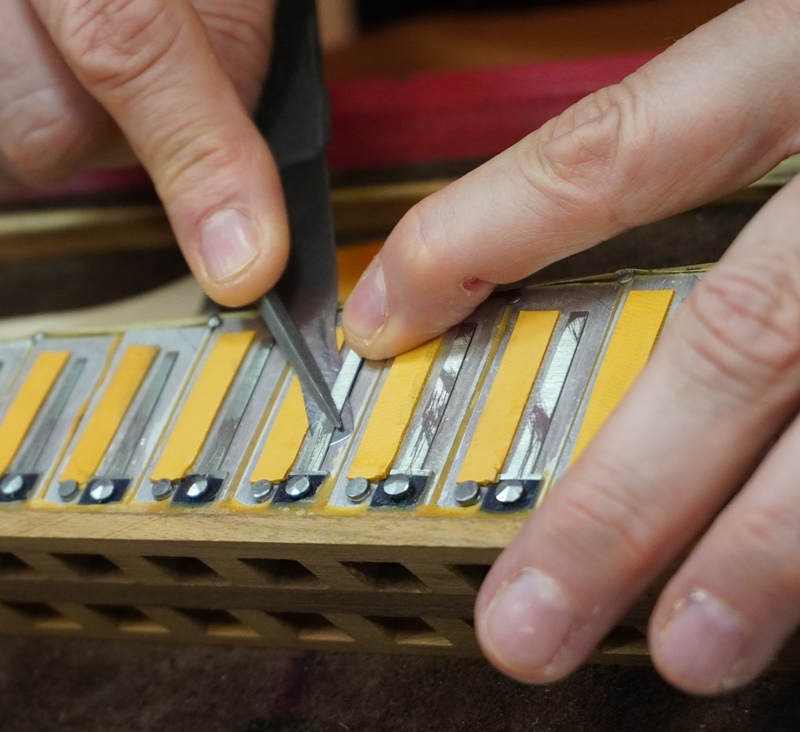 We shaped new piano keys to fit into the treble keyboard; learned to make new pistons for the bass machine; learned to program and reprogram the register switches; and got to see the inner workings of cassottos, chin registers, and free-bass converters.